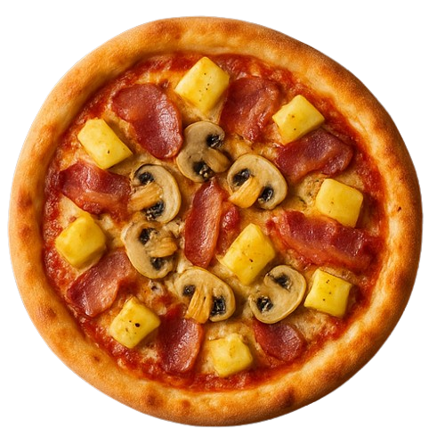 Molho de tomate do chef, bacon, cogumelos, ananás, mussarela especial e toque de orégano