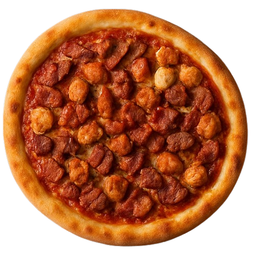 Molho de tomate do chef, mussarela especial, pedaços de picanha acebolada, bacon, requeijão cremoso Catupiry