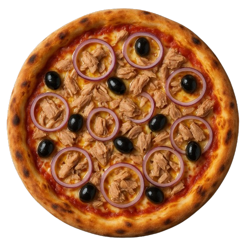 Molho de tomate do chef, mussarela especial, atum em pedaços, cebola roxa, azeitona preta portuguesa, azeite extra virgem.
