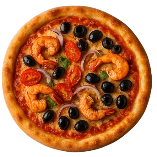 Molho de tomate do chef, mussarela especial e parmesão ralado, Camarões salteados no alho e azeite, Tomate-cereja confitado, cebola roxa laminada, finalizada com raspa limão-siciliano