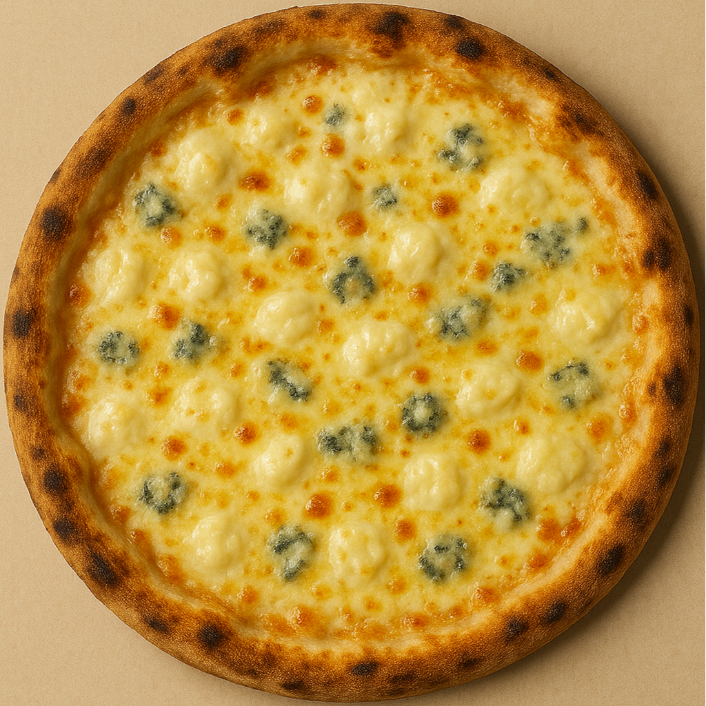 Molho de tomate do chef, mussarela especial, gorgonzola importado, parmesão curado, queijo scamorza