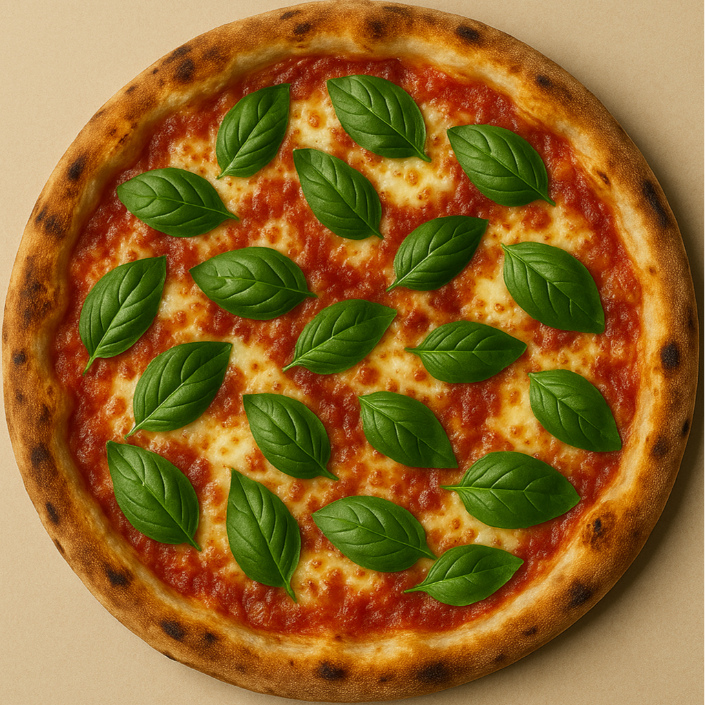 Molho de tomate do chef, queijo parmesão ralado, mussarela especial, folhas frescas de manjericão e azeite extra-virgem