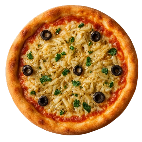 Molho de tomate do chef mussarela especial, Bacalhau desfiado e refogado no azeite com alho, cebola caramelizada, azeitonas pretas portuguesa, salsa fresca picada, finalizada com um fio de azeite extra virgem