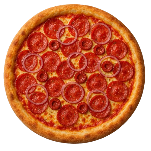 Molho de tomate do chef, Linguiça calabresa defumada artesanal, cebola roxa, mussarela especial e toque de orégano.