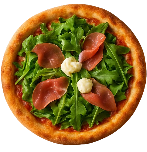 Molho de tomate do chef, mussarela especial, rúcula, prosciutto crudo, mussarela de búfala fresca